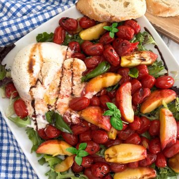 Like many other salads, this peach burrata salad should be consumed the day it is made. Leftovers do not store well as the tomatoes will release moisture the longer they sit creating a soupy texture.
